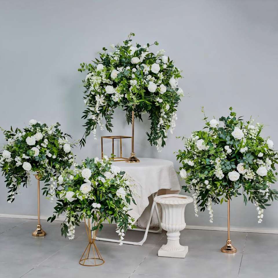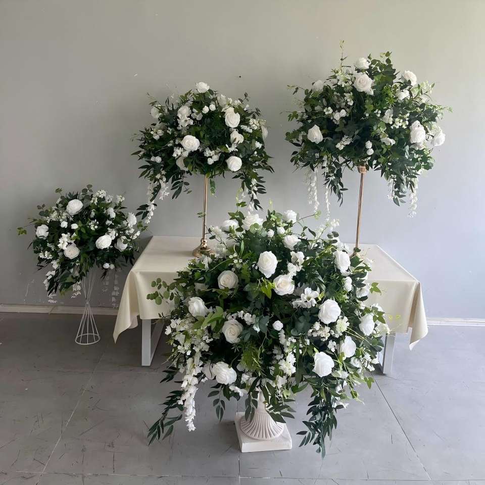 Centre de table de mariage, boule de fleurs en soie blanche, feuillage vert, feuilles d'eucalyptus, plante, boule de fleurs pour événement de mariage