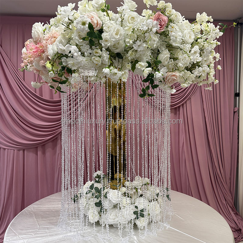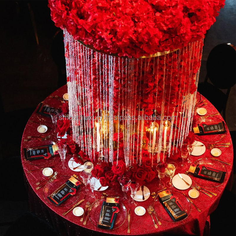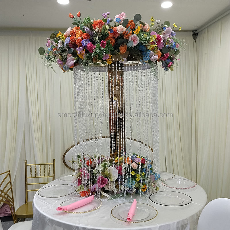 Décoration de table de mariage, rideau de perles en cristal, supports à fleurs, miroir doré, support à fleurs rond en métal, centre de table