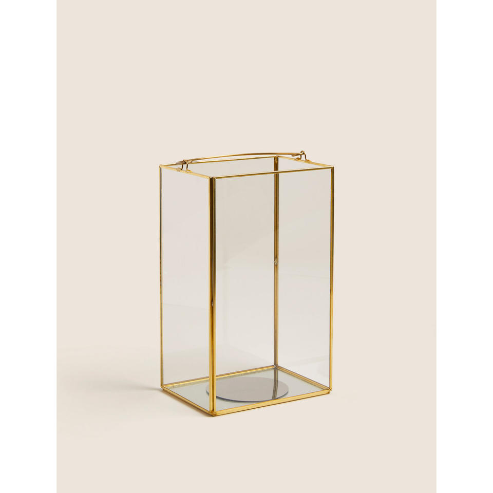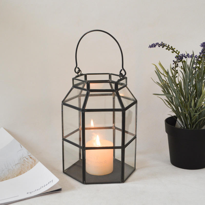 Formes modernes personnalisées Bougeoirs en verre au mercure Verre clair Cadre en métal doré Lanterne décorative Style Maison de Noël