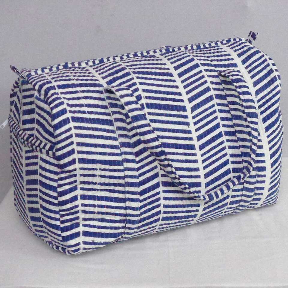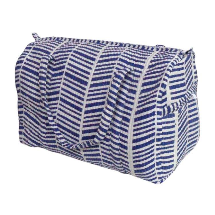 Sac de voyage élégant et écologique à rayures, trousse de toilette, sac fourre-tout en coton doux imprimé à la main avec fermeture éclair