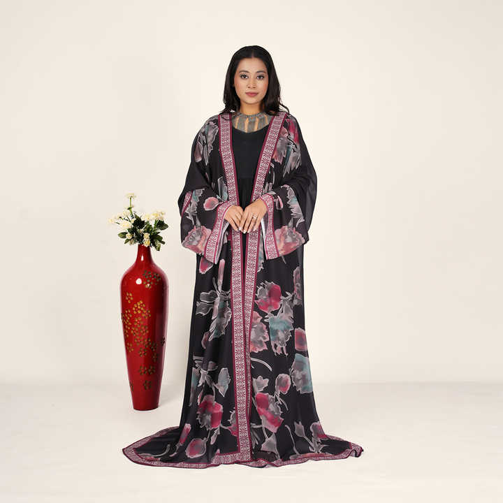 Abaya légère à imprimé floral délicat, bordure contrastante, manches amples, tombé fluide, idéale pour les soirées.