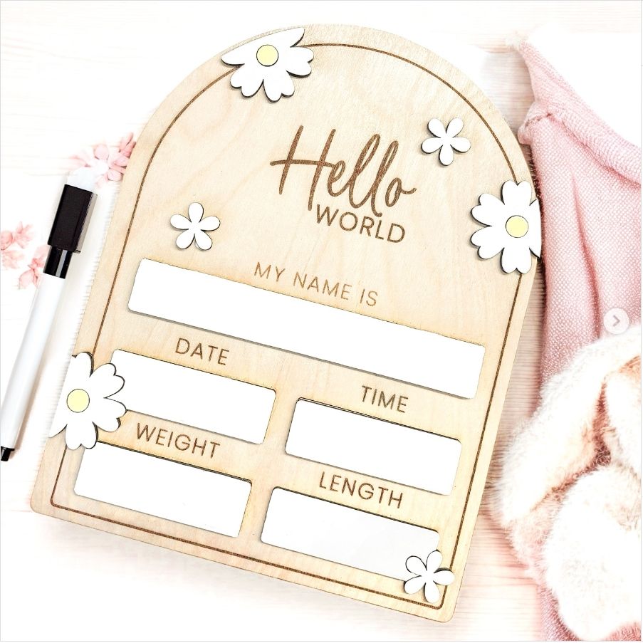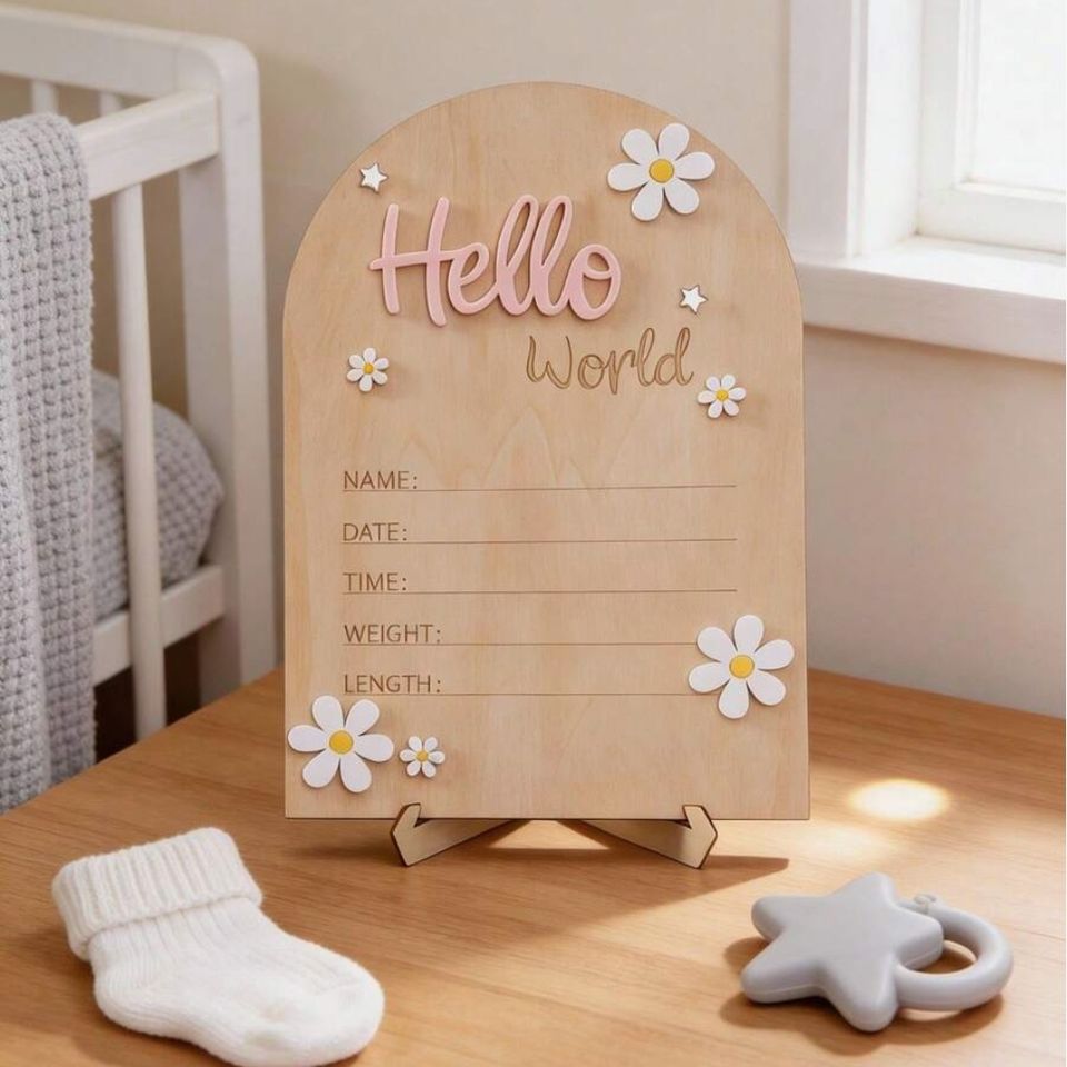 Carte de souvenir de croissance pour bébé en bois 'Bonjour le Monde' pour nourrissons, motif marguerites, style neutre, pour fête de bienvenue du bébé