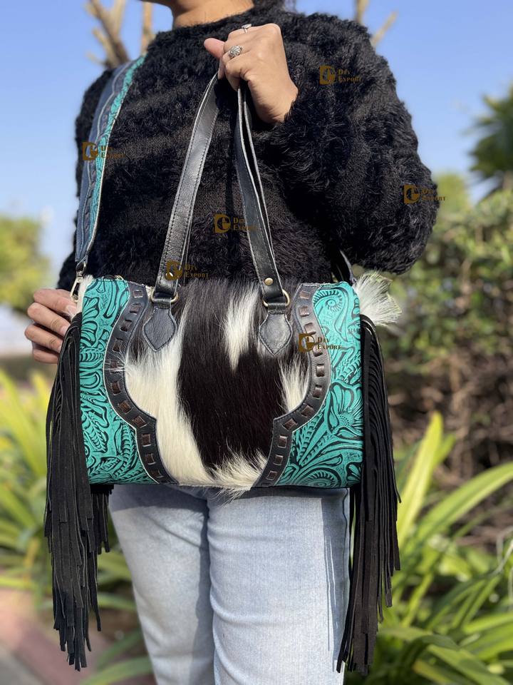 Sac fourre-tout en cuir de vachette occidental, cuir sculpté à la main, franges en cuir, sac à main élégant, sacs en cuir pour femmes, multi-usages