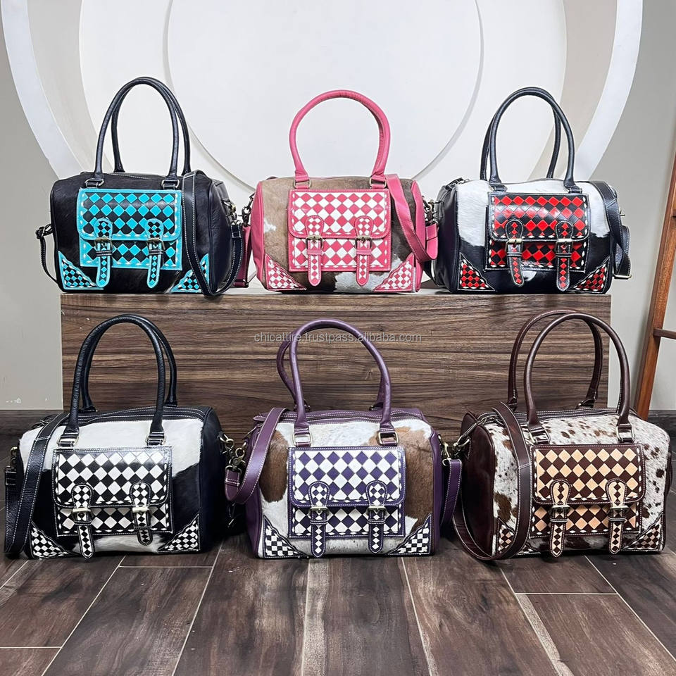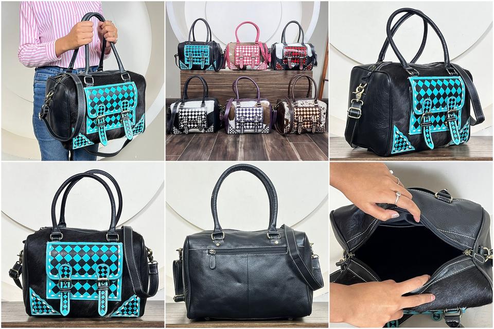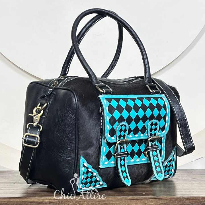 Sac à main en cuir de vachette de style western vintage, style rodeo, avec rabat orné de motifs à carreaux turquoise et noir, sac bandoulière et épaule pour femme