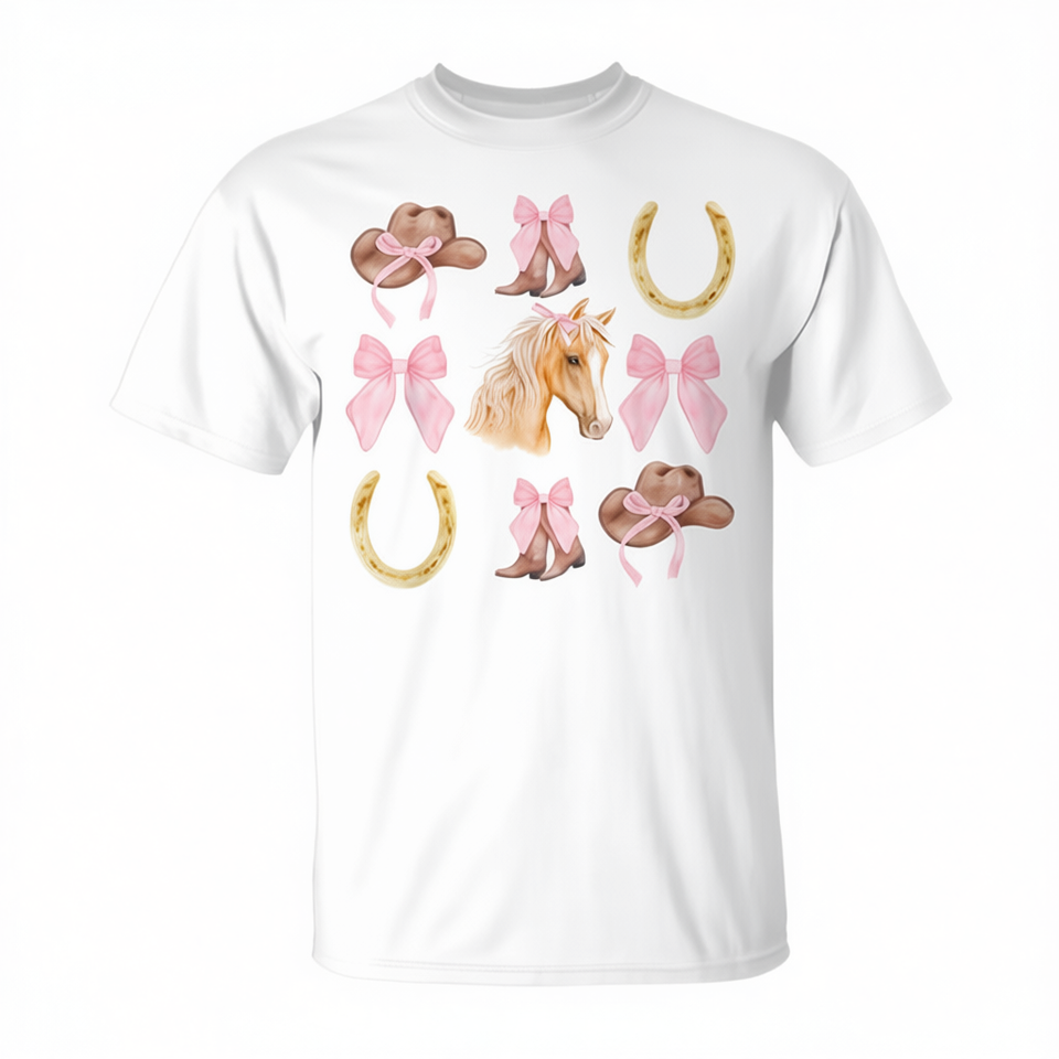 T-shirt Western Girl Country Rodeo Pink Cowgirl Horse Bow pour femme adulte, manches courtes, col rond, impression numérique