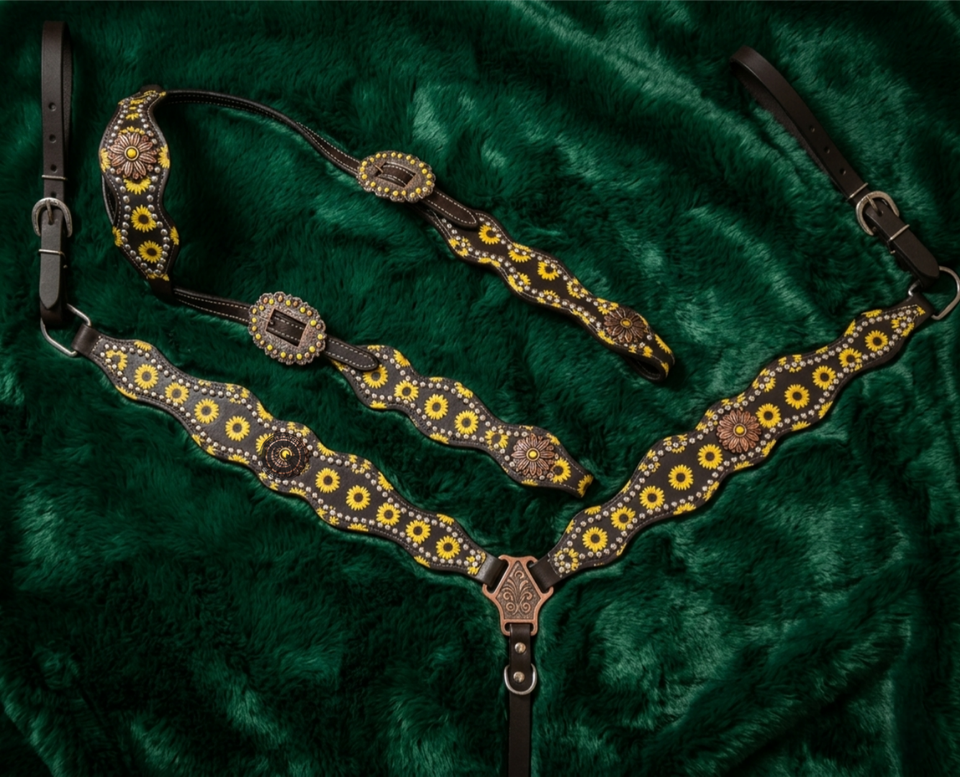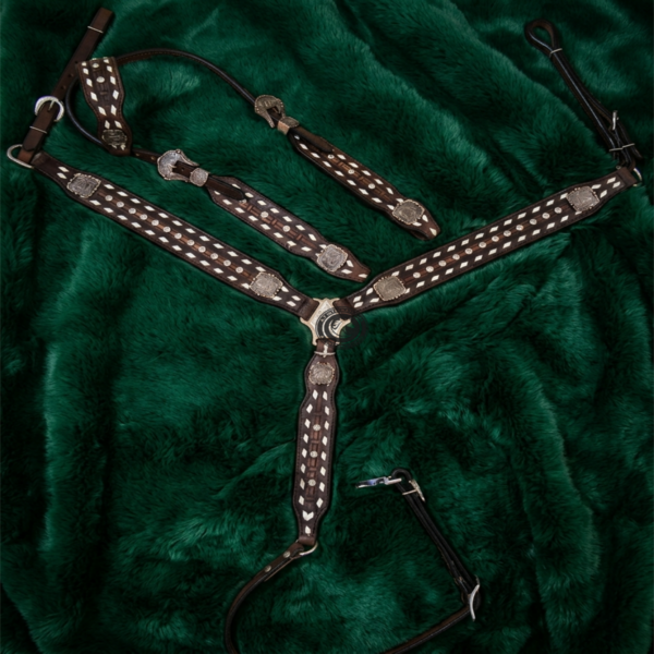 Ensemble d'équipement d'équitation western : Bridon, têtière et harnais de poitrine avec un design élégant et travaillé pour l'entraînement et les compétitions de rodéo.