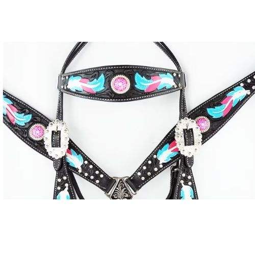 Western Leather Handtooled Tack Set 100% Haute Qualité Rose et Bleu Peint Headstall Poitrine Collier Durable Caractéristique