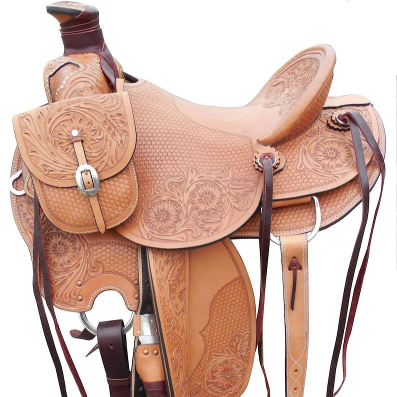 Western Leather Saddle Roping Ranch Hand Tool Floral Design English Horse Racing Products From India Wade Tree a Fork Premium