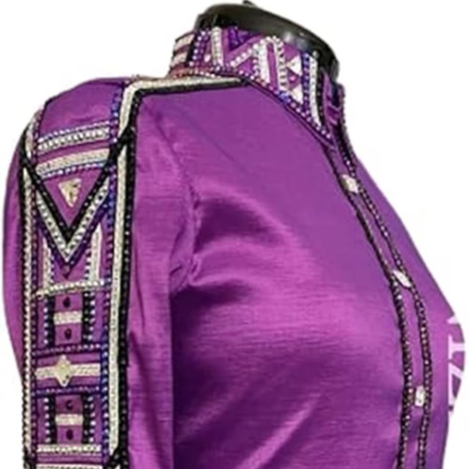 Western Show Shirt Stretch Taffeta Emerald Silver Purple White Crystal Stone Detail on Collar Shoulders Sleeves & Cuffs