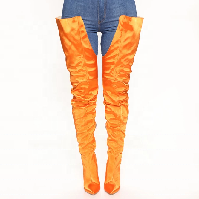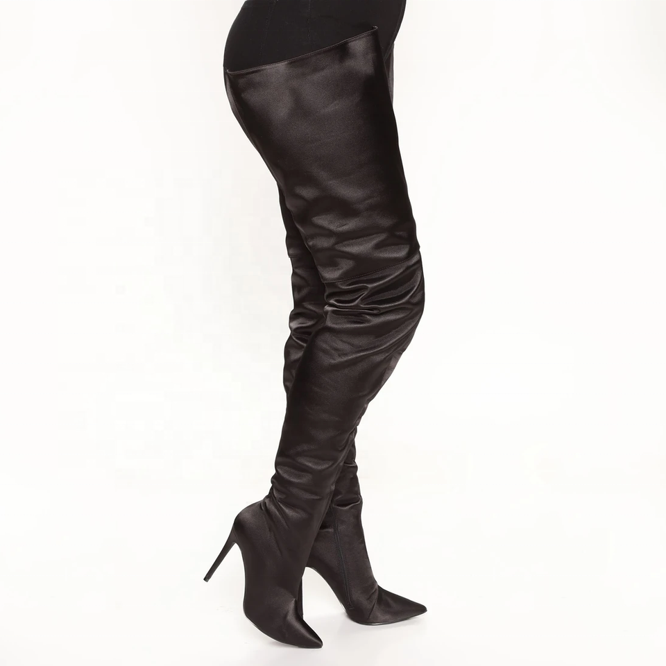 Bottes hautes pour femme style occidental, en satin lisse, à talon aiguille, bout pointu, avec fermeture éclair latérale, montantes jusqu'au-dessus du genou