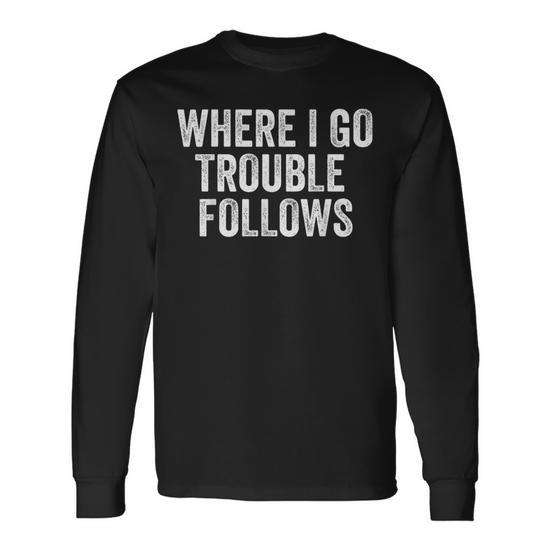 T-shirt à manches longues unisexe à col rond « Où que je me rende, les ennuis suivent » – Vêtement promotionnel pour adulte