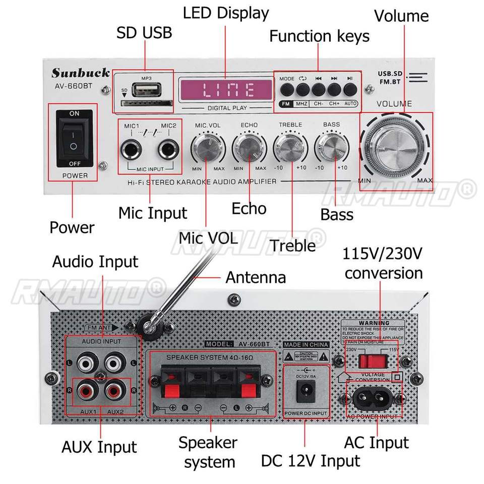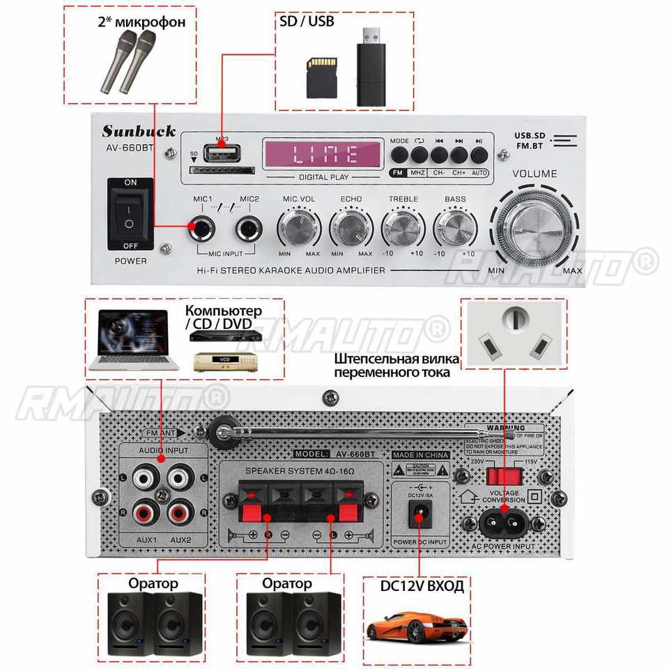 Amplificateur de puissance blanc 2000W, 2.0 canaux, amplificateur audio pour home cinéma, DC 12V 110V/220V, prise en charge de l'égaliseur, FM, SD, USB, 2 micros, Bluetooth 5.0