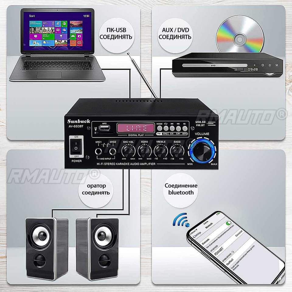 Amplificateur de puissance blanc 2000W, 2.0 canaux, amplificateur audio pour home cinéma, DC 12V 110V/220V, prise en charge de l'égaliseur, FM, SD, USB, 2 micros, Bluetooth 5.0