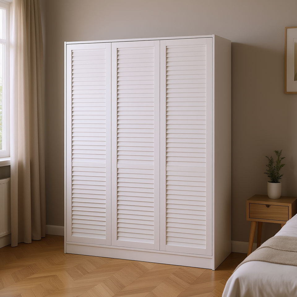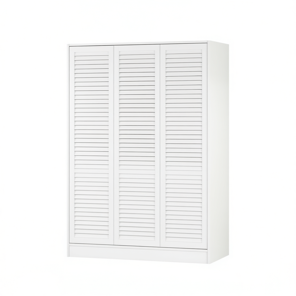 Armoire à volets blancs à 3 portes avec étagères pratiques pour le rangement de la chambre