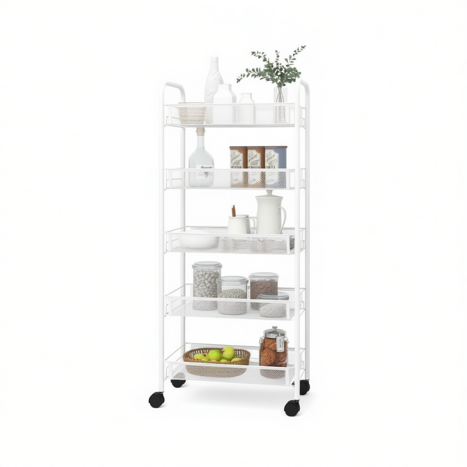 Chariot de cuisine blanc à 5 niveaux, 18,1x10,2x41,3 pouces, étagère de rangement en fer avec roulettes pour l'organisation de la cuisine