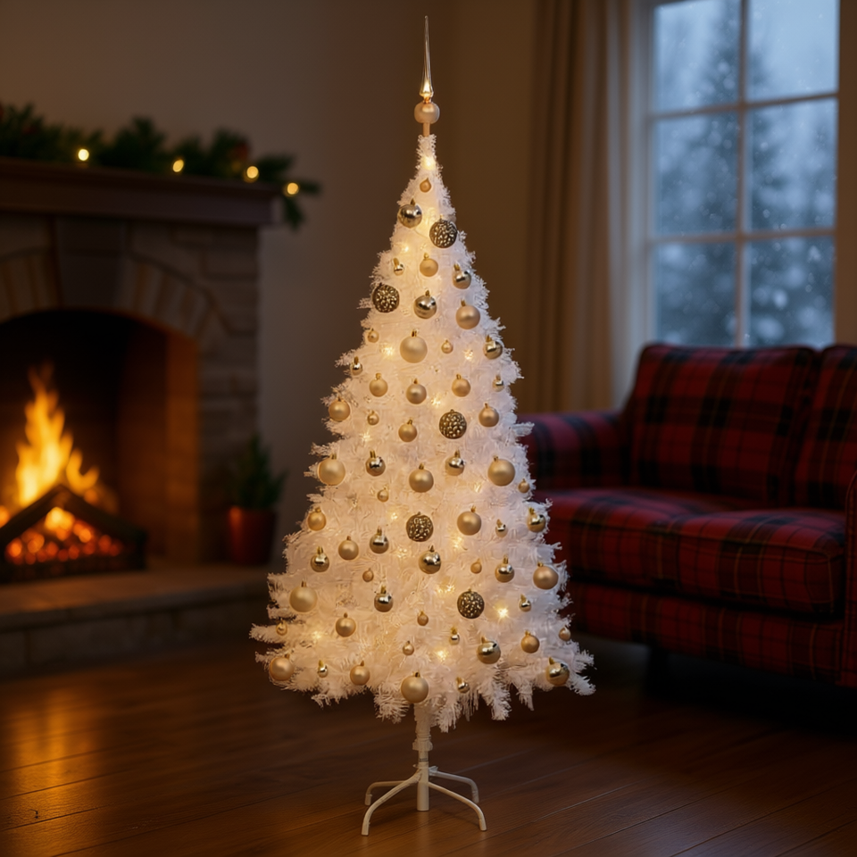 Sapin de Noël artificiel blanc de 59,1 pouces en PVC pré-éclairé avec un ensemble de boules, lumières LED chaudes, base sur pied pour intérieur