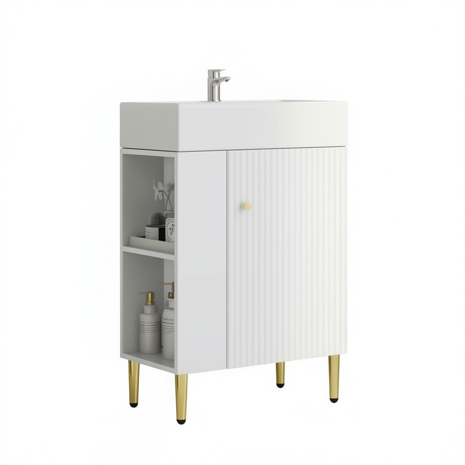 Meuble-lavabo blanc pour salle de bain, 21,6 pouces, avec lavabo simple en céramique, rangement latéral gauche, design moderne sur pied