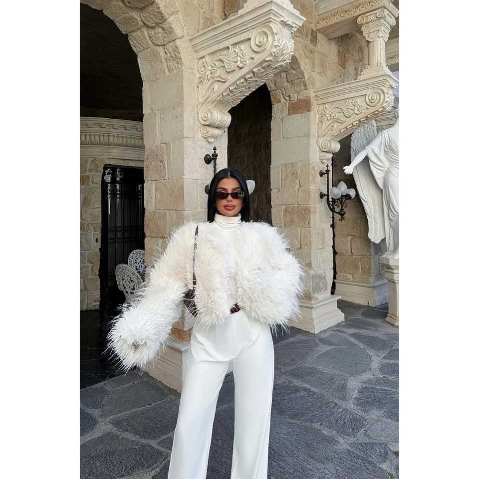 White Blaise Faux Fur Jacket Long and Short Single Breasted with Plaid Print Dyed Mink Rabbit Fox Woven Processing