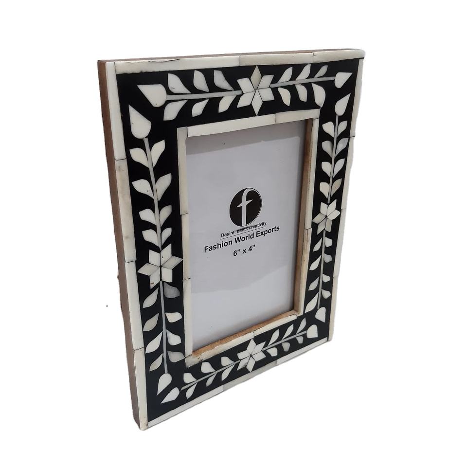 Cadre photo incrusté d'os floral à bordure blanche en résine noire et blanche faite à la main en Inde
