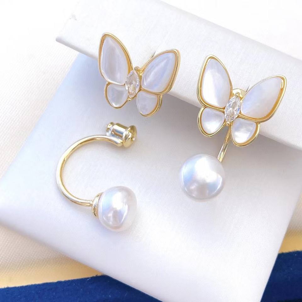 Boucles d'oreilles en nacre de papillon blanc micro-incrustées de perles d'eau douce, bijoux de précision de Zhuji, perles d'eau douce de 7-8 mm