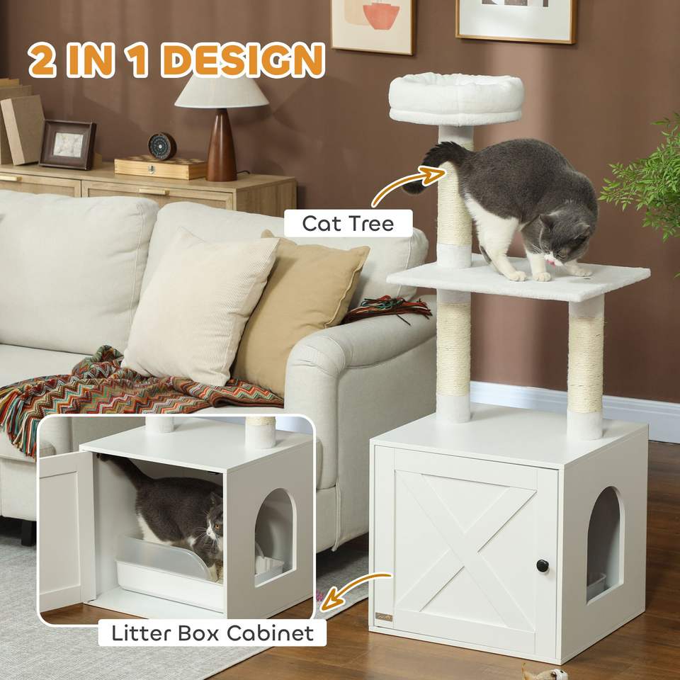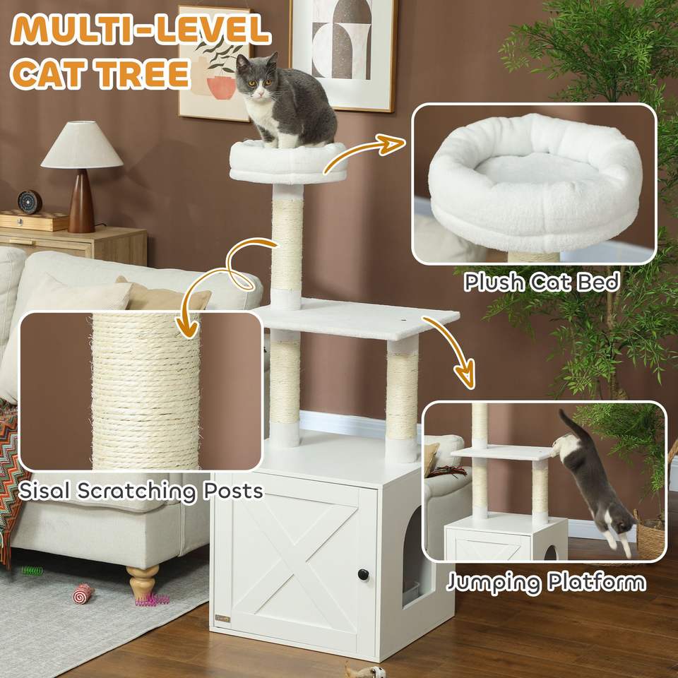 Arbre à chat blanc avec enclos pour litière, poteaux à gratter, lit, plateformes d'escalade et plateformes intérieures pour chats