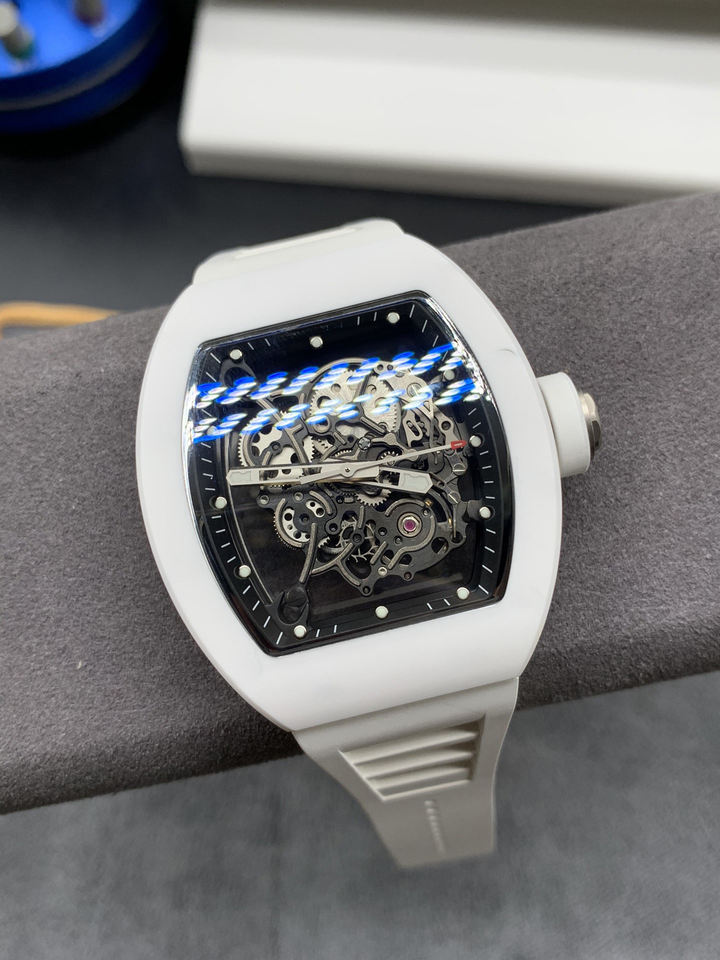 Montre mécanique avec boîtier en céramique blanche, équipée de deux boîtes à remontage séparées et d'un balancier visiblement visible