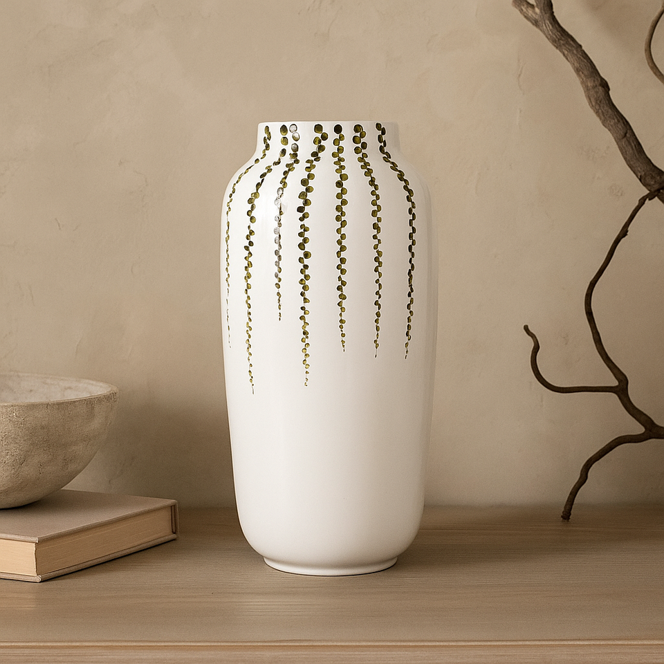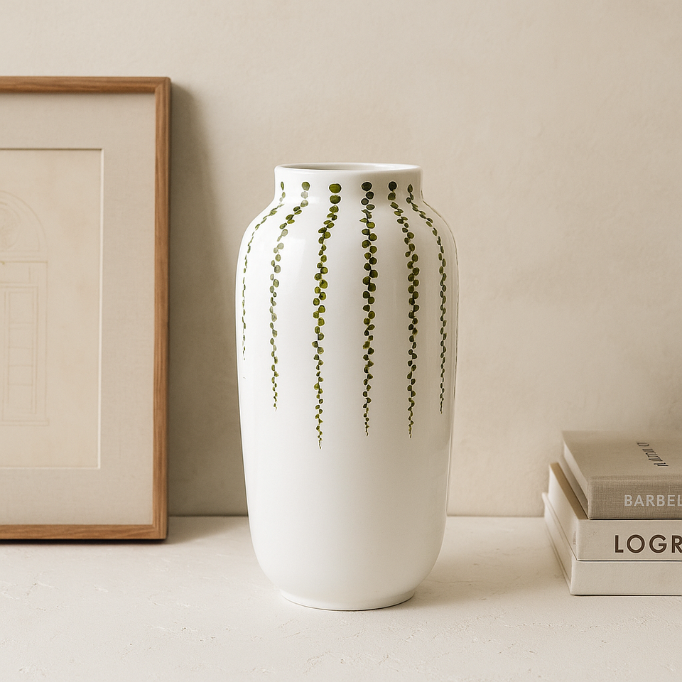 White Ceramic Vase Hanging Dot Vine Pattern Rounded Cylindrical Shape Hand Painted Pottery for Modern Home Decor for Weddings