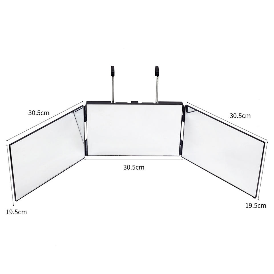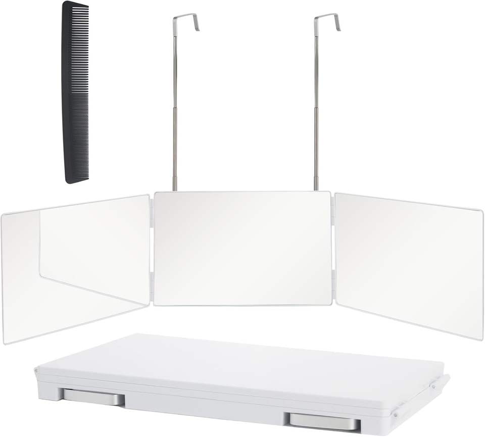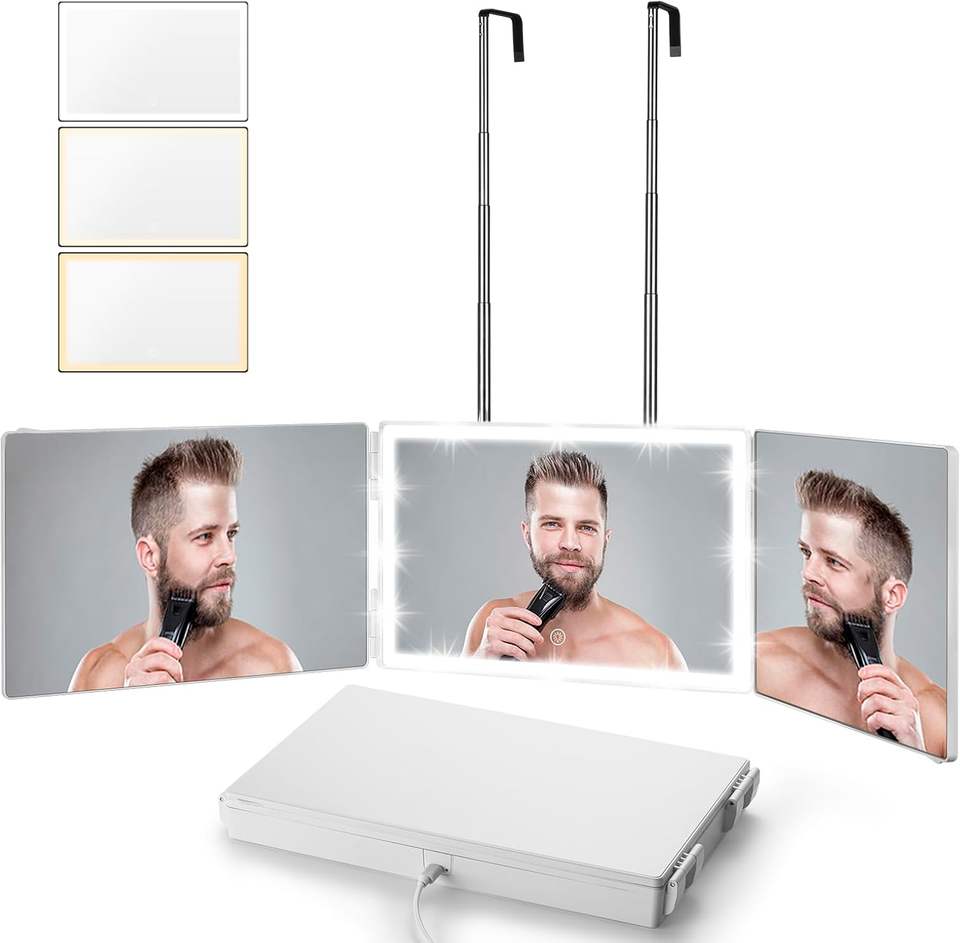 Miroir à trois volets de couleur blanche pour la coupe de cheveux, en verre véritable, réglable, avec lumière LED à trois températures de couleur pour le maquillage et le coiffage