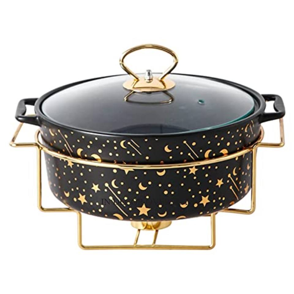 Plat de chauffe-plats rond en métal de meilleure qualité enduit de poudre de texture unique de couleur blanche avec le support d'or et le couvercle supérieur en verre