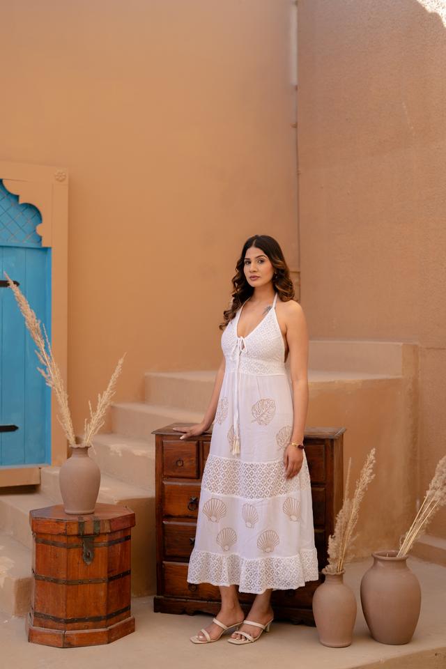 Robe mi-longue en dentelle crochet blanche à imprimé coquillage, robe d'été de style bohème, tenue de fête prénuptiale, thème nautique, robe de plage élégante