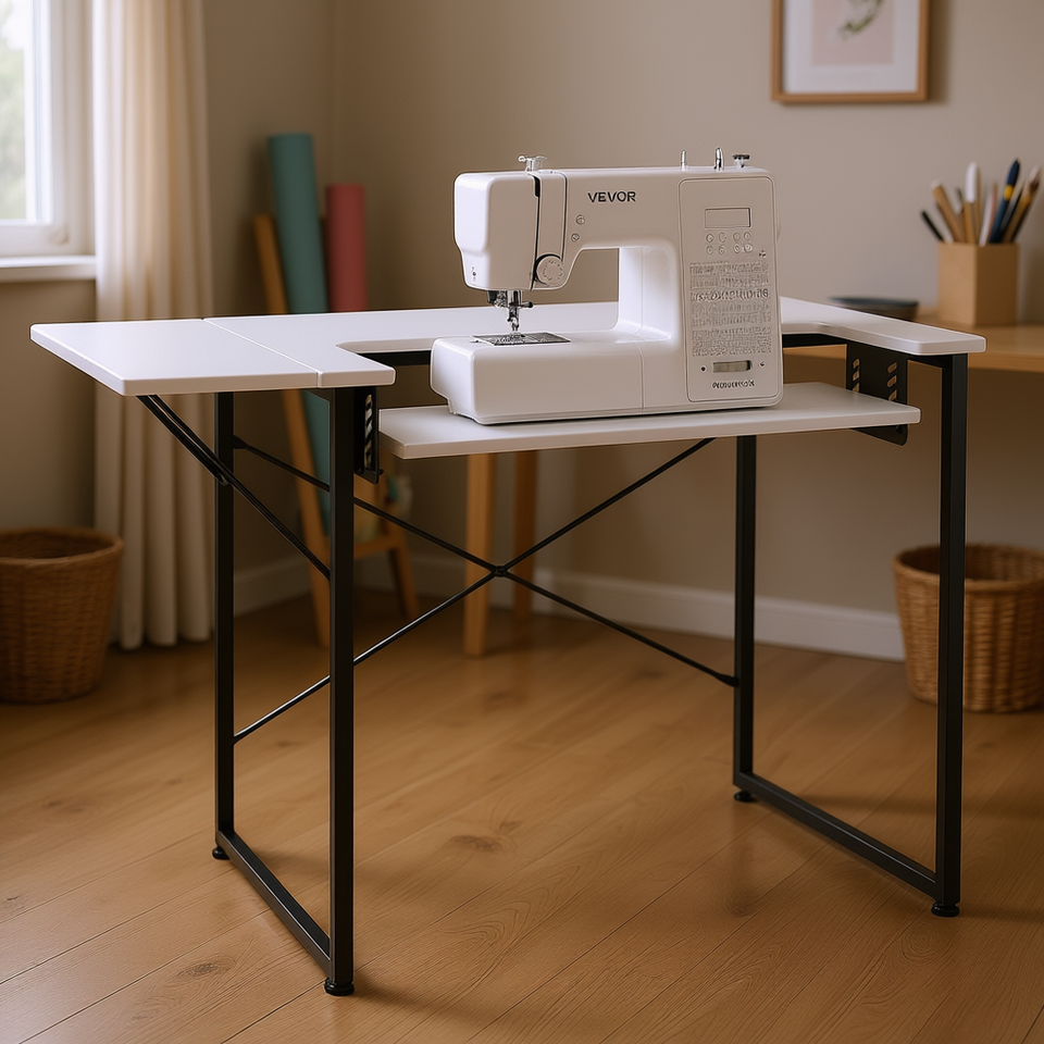 Table de couture pliable blanche avec pieds en acier réglables, portable, pour usage domestique et en studio