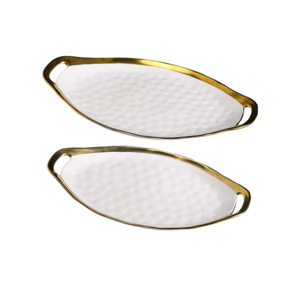 Plateau à poignée de forme ovale en aluminium de couleur or blanc avec ensemble de deux poignées de plateau de service en métal élégant pour les mariages fini or