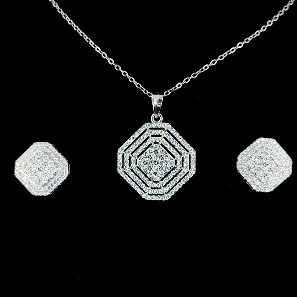 Collier pendentif en or blanc de forme octogonale serti de diamants, avec boucles d'oreilles assorties serties de diamants, ensemble de bijoux en diamants