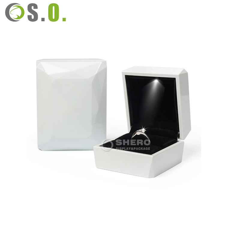 Boîte à bijoux en plastique avec logo personnalisé, éclairage LED, pour collier, bracelet, boucles d'oreilles et bague, en or blanc et rouge, vente en gros