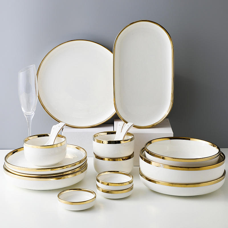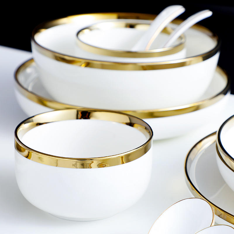 Service de Table en Porcelaine Luxe Blanc à Bordure Dorée, Bol à Riz et Assiette Dorée Style Nordique Céramique Moderne