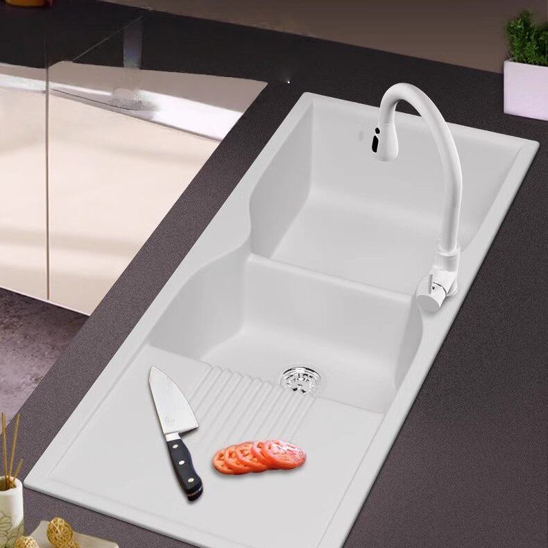 Évier de cuisine double en granit blanc et quartz avec égouttoir, à encastrer sous plan ou sur plan, robuste et moderne