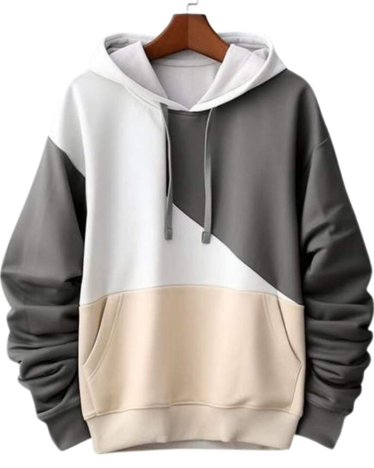 Sweat-shirt à capuche unisexe décontracté en molleton doux, style streetwear, chaud et élégant, avec blocs de couleur blanc, gris et beige.