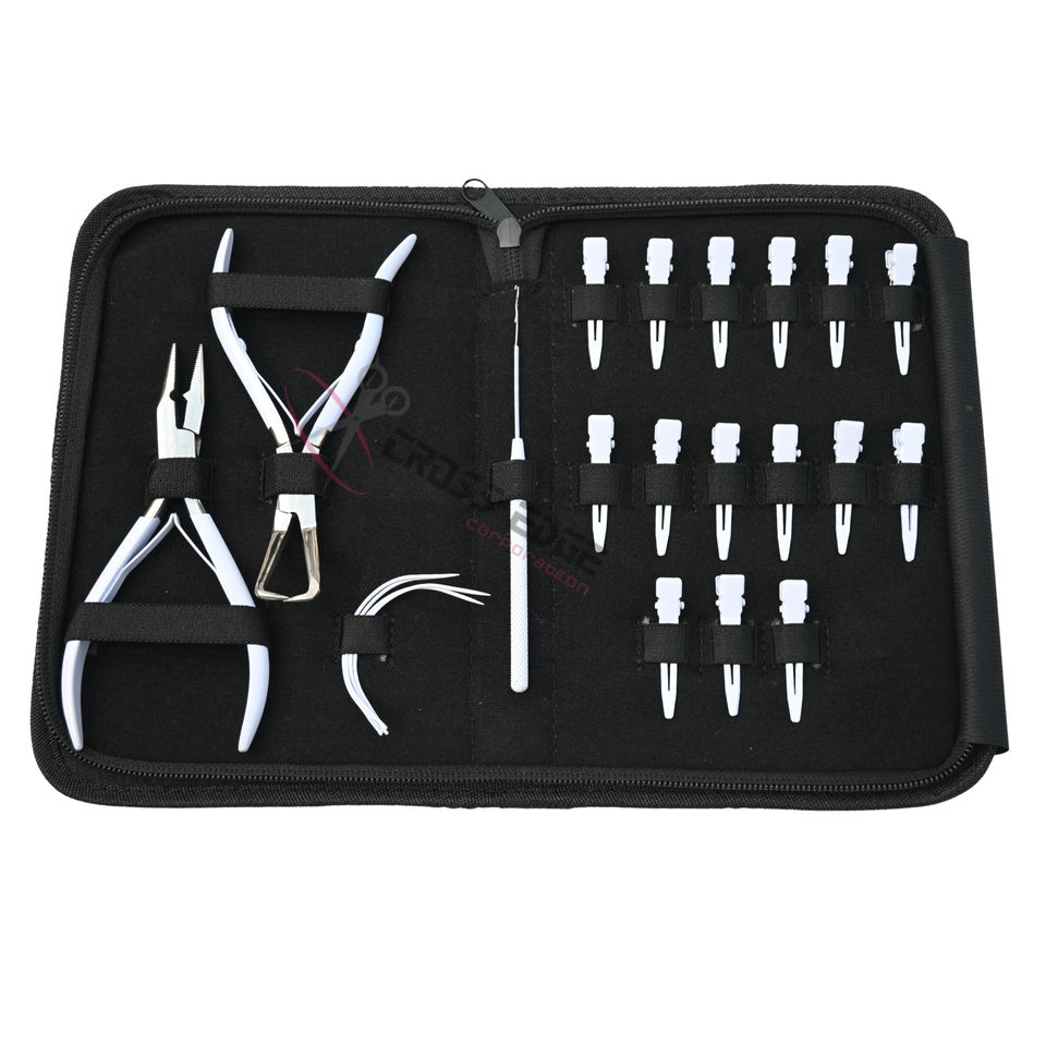 Kit d'outils pour extensions de cheveux blancs : Pince à micro-perles, Pince à sertir les micro-perles, Crochet de tirage, Aiguilles courbées, Pinces de sectionnement