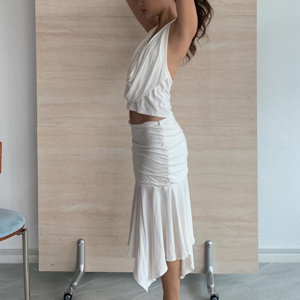 Ensemble deux pièces blanc pour femme : haut court drapé à col bénitier et jupe midi asymétrique froncée