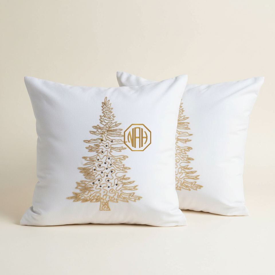 White Handmade Patchwork Embroidered Gold Christmas Tree Decorative Pillow Cover Festive Sofa Cushion 100% Polyester