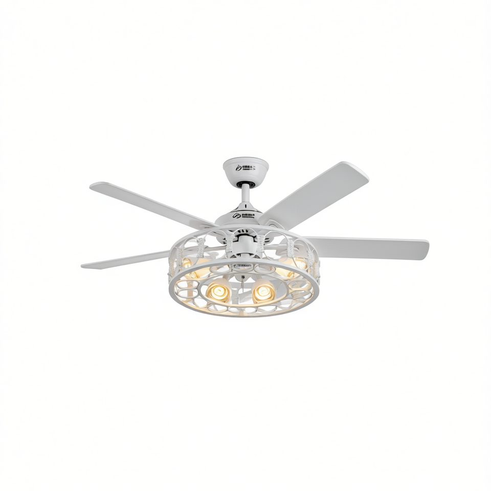 Ventilateur de plafond blanc en fer 52 pouces 6 pales avec 4 ampoules LED design en cage télécommandé pour usage domestique