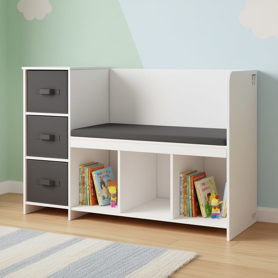 Banc de rangement blanc pour enfants avec 6 compartiments, 3 tiroirs, coussin de siège amovible, coin lecture, étagère pour chambre de tout-petit