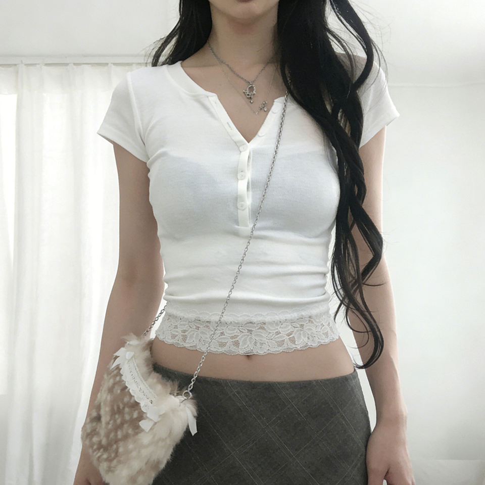 T-shirt décontracté pour femme à manches courtes, col en V, en dentelle blanche, boutonné, été, éco-responsable