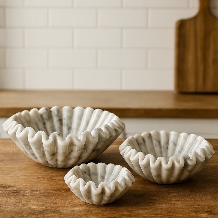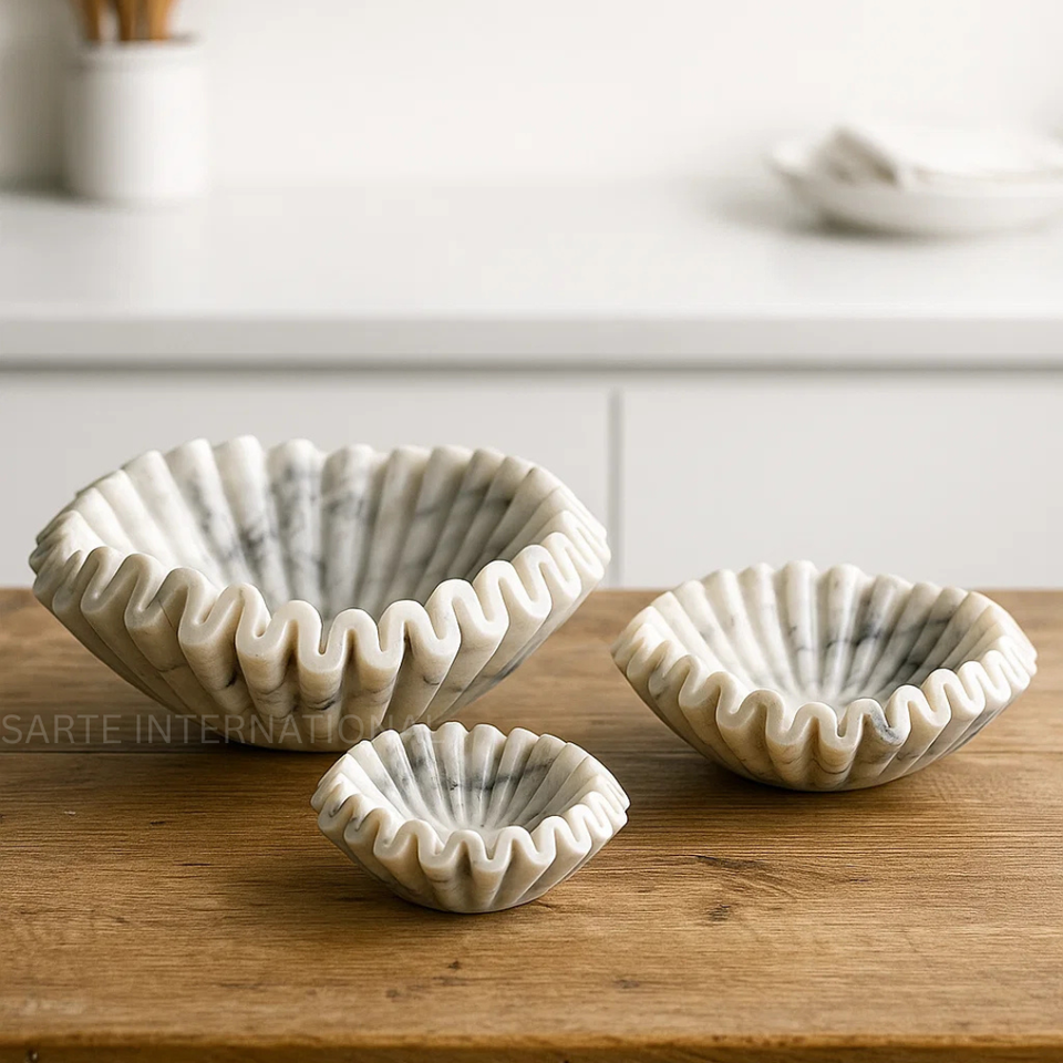 Bol décoratif de style indien en marbre naturel de luxe, sculpté à la main, écologique, personnalisable, avec volants, centre de table, bol à fruits moderne