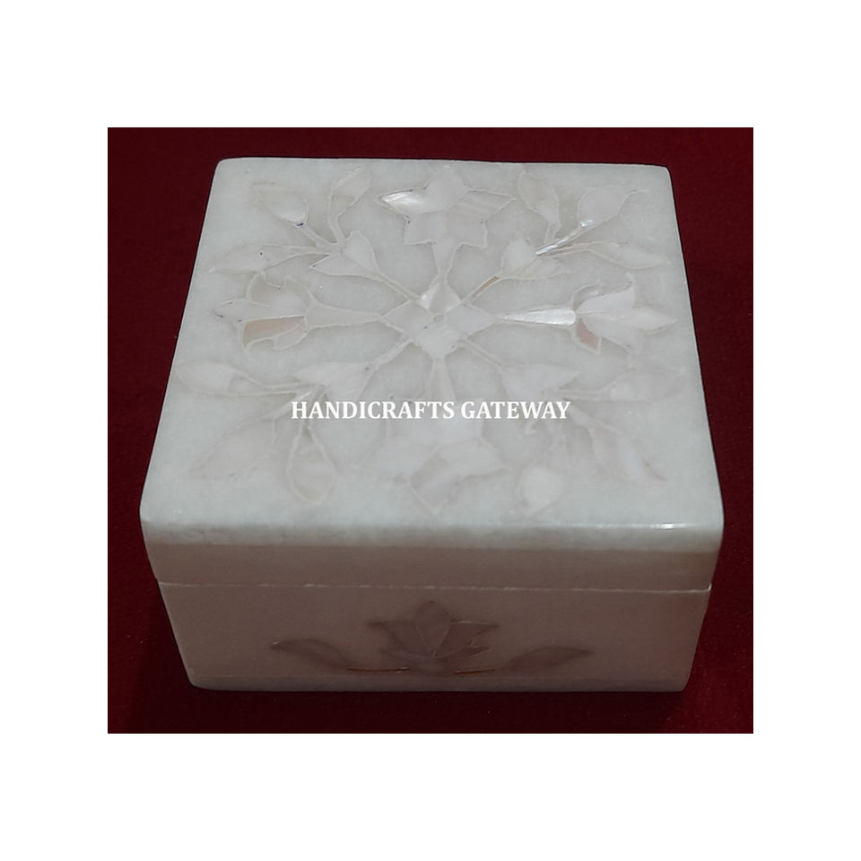 Boîte à bijoux incrustée de nacre en marbre blanc Forme carrée Design de fleurs Utilisé Décoration de la maison et but de cadeau pour les invités