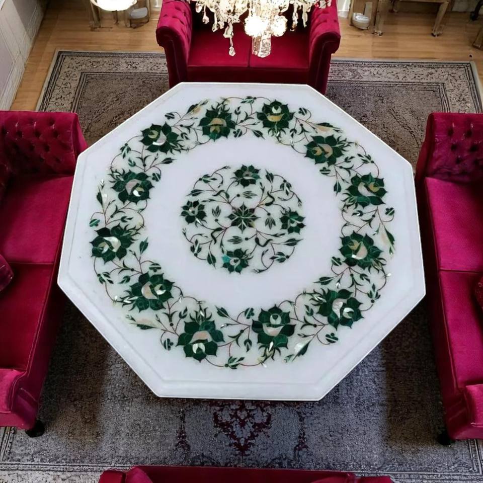 Marbre blanc octogone forme incrustation décorative Art floral travail conception Table basse dessus meubles de luxe faits à la main