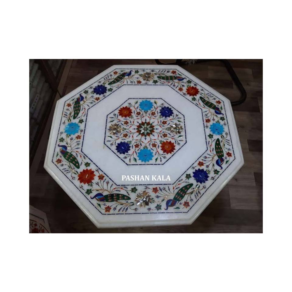 Dessus de table en marbre blanc Incrustation de forme octogonale Produit super fabuleux pour la décoration d'hôtels et de restaurants Dessus de table unique
