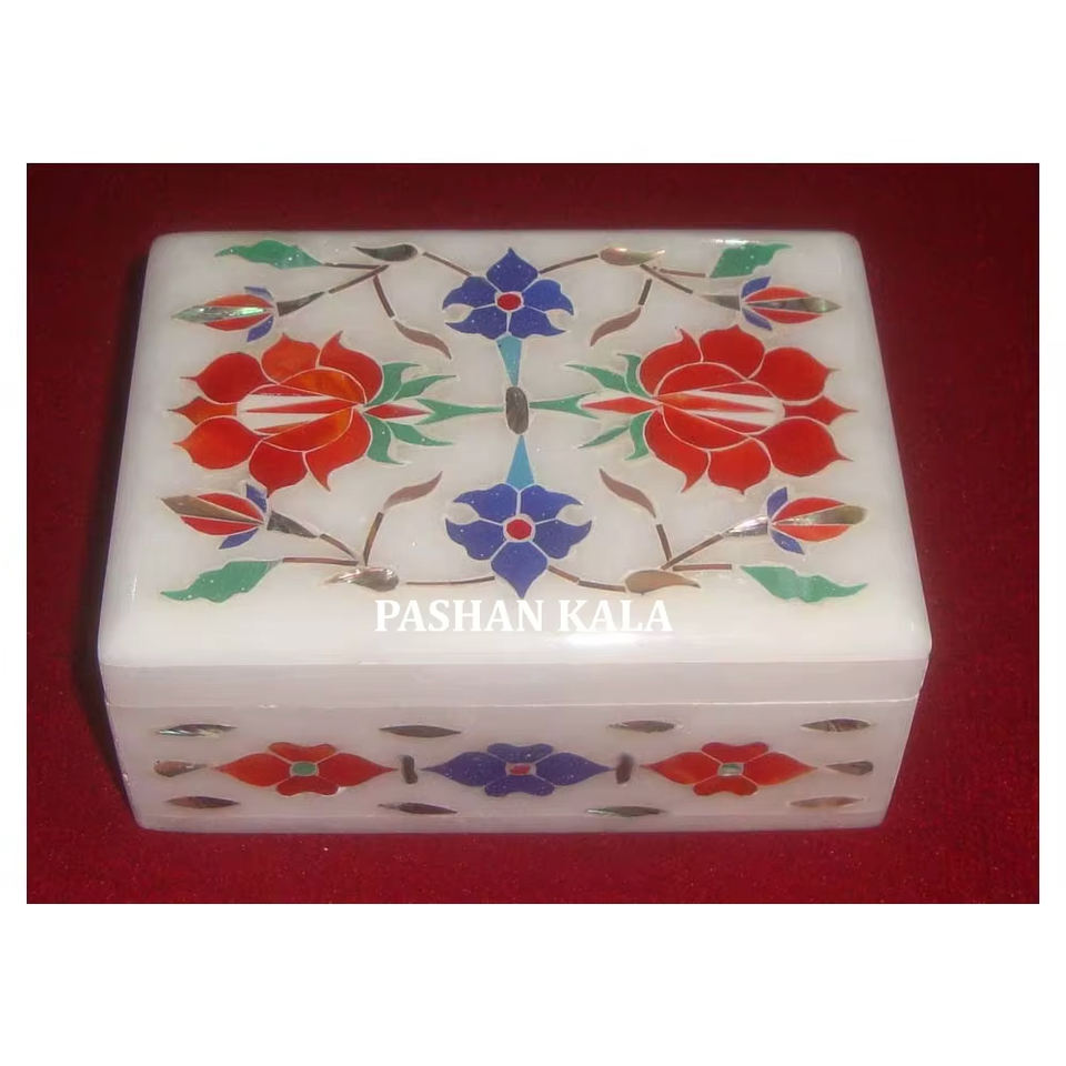 White Marble With Fine Finishing And Smooth Polished Rectangular Shape Flower Inlay Design Jewelry Box For Reselling Purpose