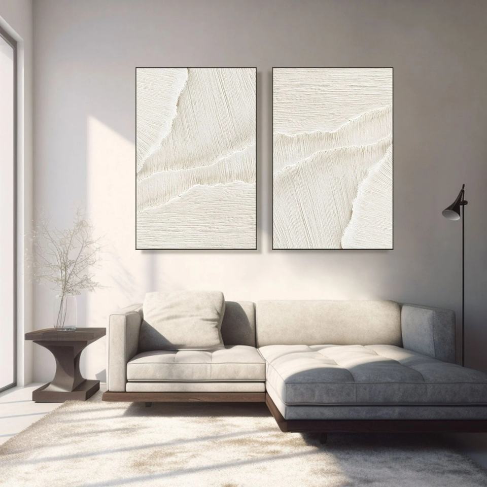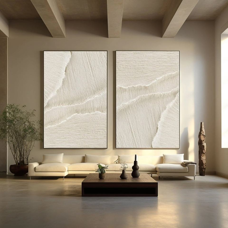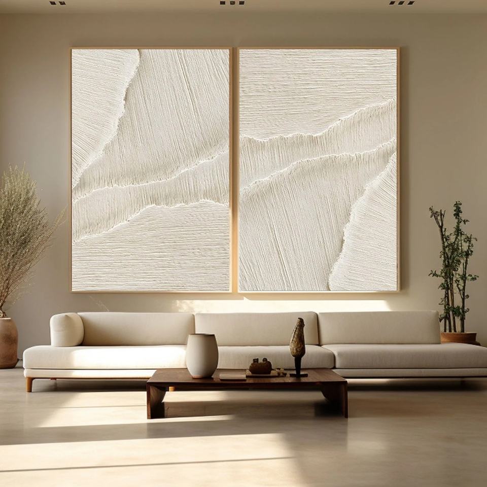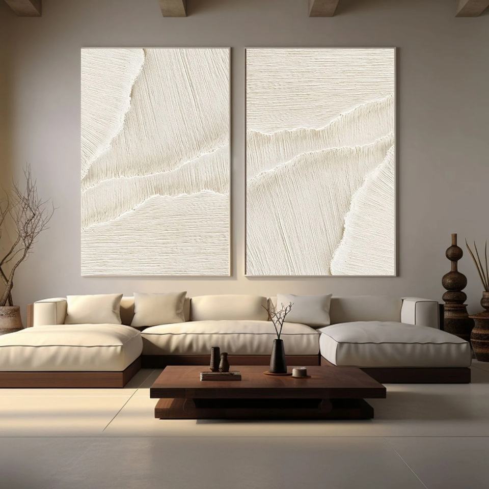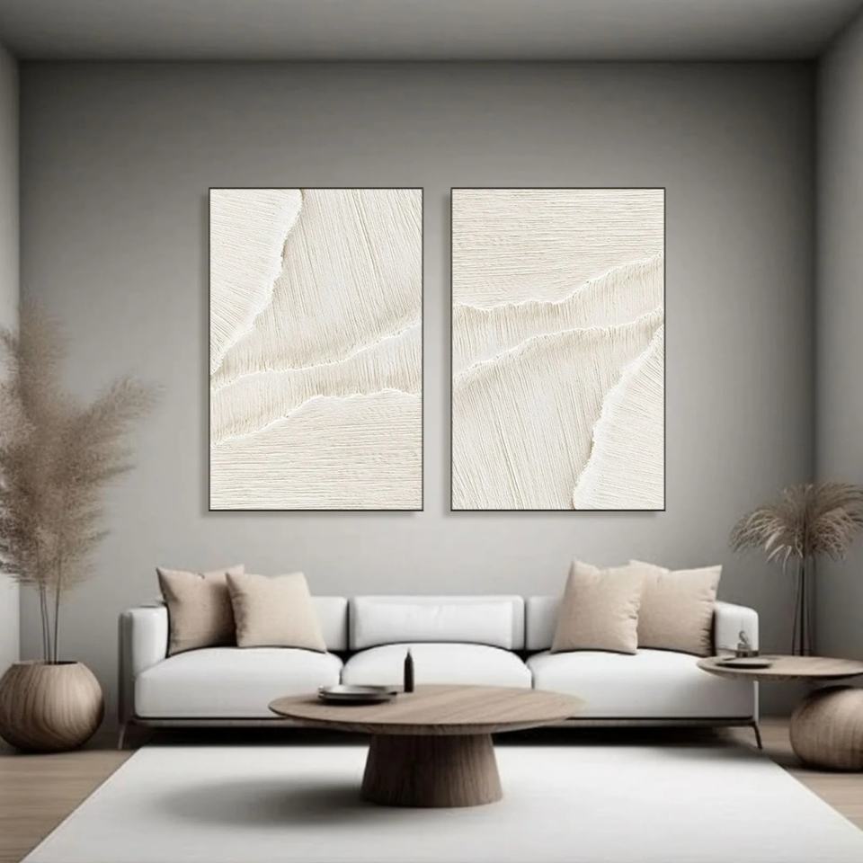 Ensemble de 2 tableaux abstraits minimalistes Wabi Sabi blancs, peints à la main sur toile acrylique, pour la décoration murale de la maison et des galeries