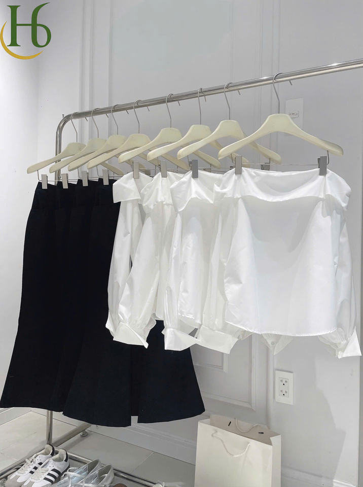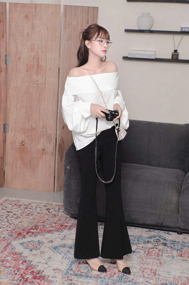 Ensemble haut blanc épaules dénudées et pantalon noir évasé à jambe droite, en mélange de coton du Vietnam, col bateau, manches longues, féminin, décontracté, uni